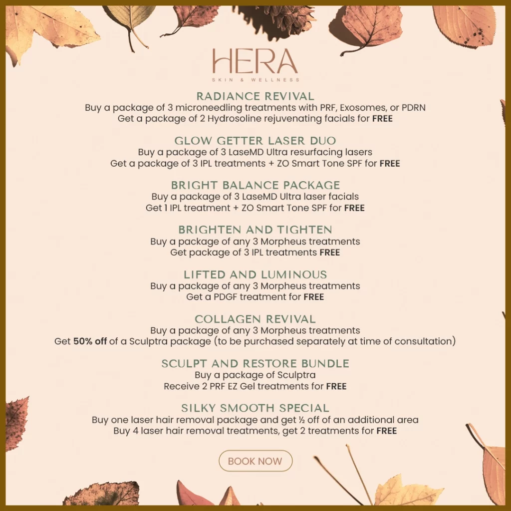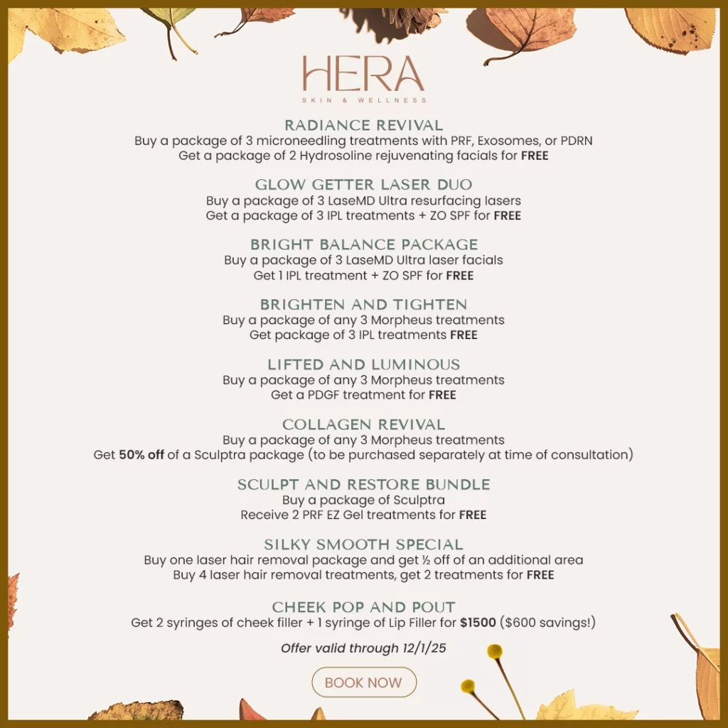 Hera is a boutique medical spa focused on non-invasive medical aesthetic treatments for anti-aging, skin health, and overall wellness. Services we offer include injectables (e.g. Botox, SkinVive etc.) medical-grade facials and skincare, dermaplaning, LaseMD Ultra laser skin resurfacing, Morpheus8 and Genius RF microneedling, Keralase hair restoration, Women’s Wellness, Massage, and Head Spa. Our providers are devoted to staying up-to-date on the most advanced aesthetic technologies and evidence-based procedural techniques. Our providers at Hera specialize in techniques to provide subtle enhancements that elevate your natural beauty. We are incredibly proud of our ability to personalize care so that we can truly understand our clients’ goals and make them an active part of their care plan. When you come to Hera, your health, comfort, and happiness are our main priorities. We can’t wait to help you look and feel your best!